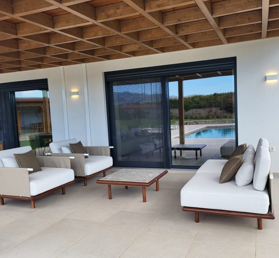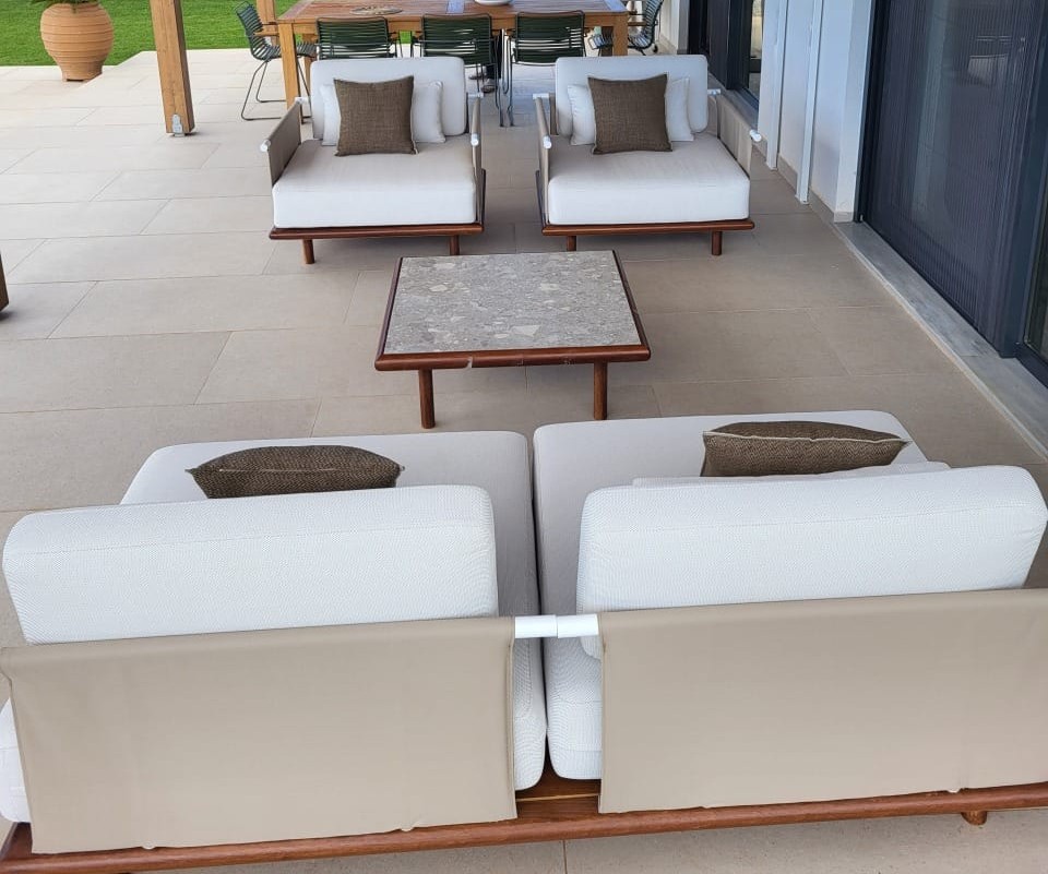 Ειδική κατασκευή επίπλων εξωτερικού χώρου Zoro, βάση από μασίφ ξύλο ιρόκο, γαλβανιζέ μεταλική πλάτη και μπράτσα.